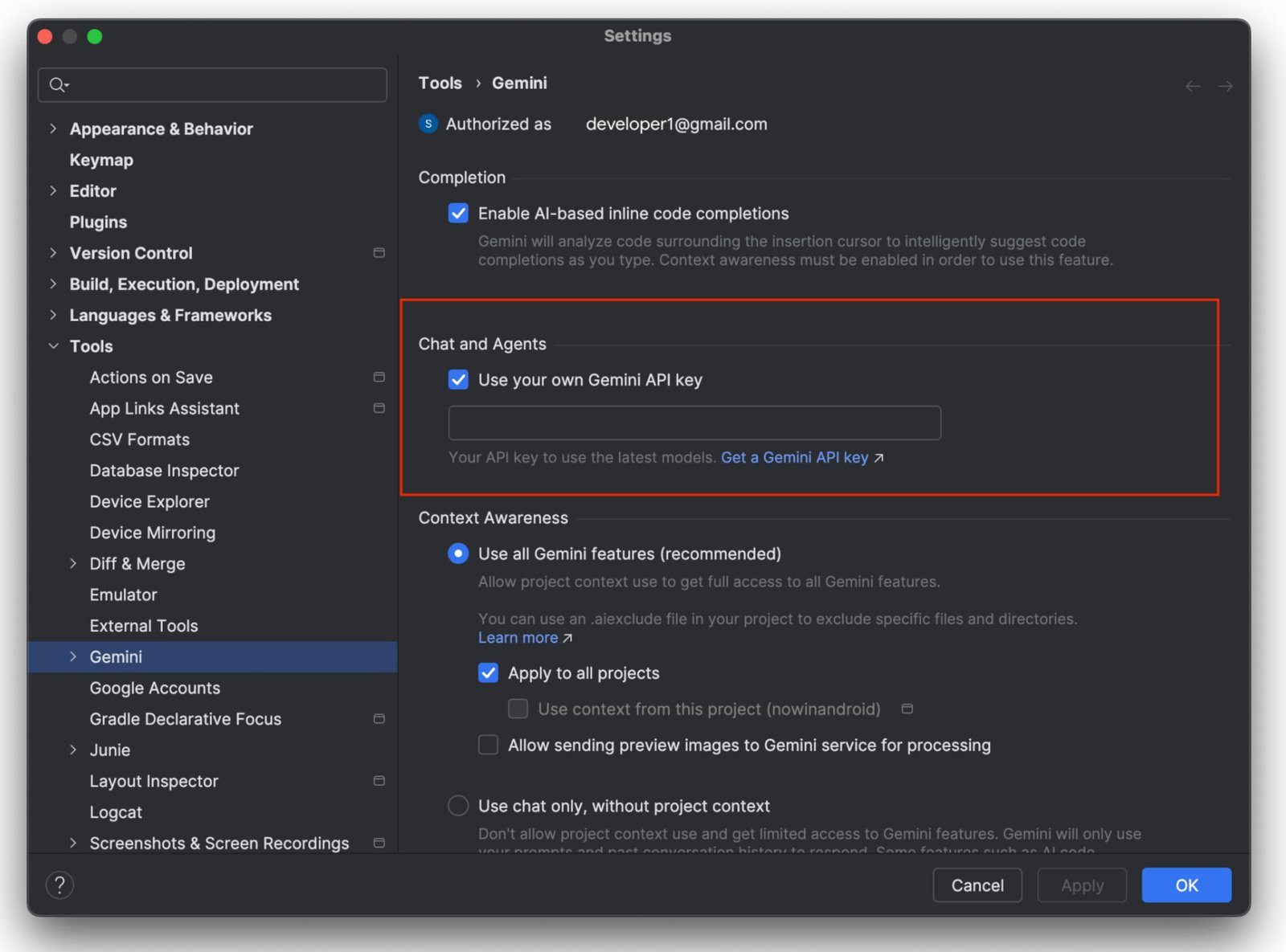 And here’s a handy tip: If you have a Gemini API key, you can supercharge Agent Mode using Gemini 2.5 Pro’s 1 million token context window. Just head to File (Android Studio on macOS) > Settings > Tools > Gemini to set it up for more precise instructions, code suggestions, and overall better responses.